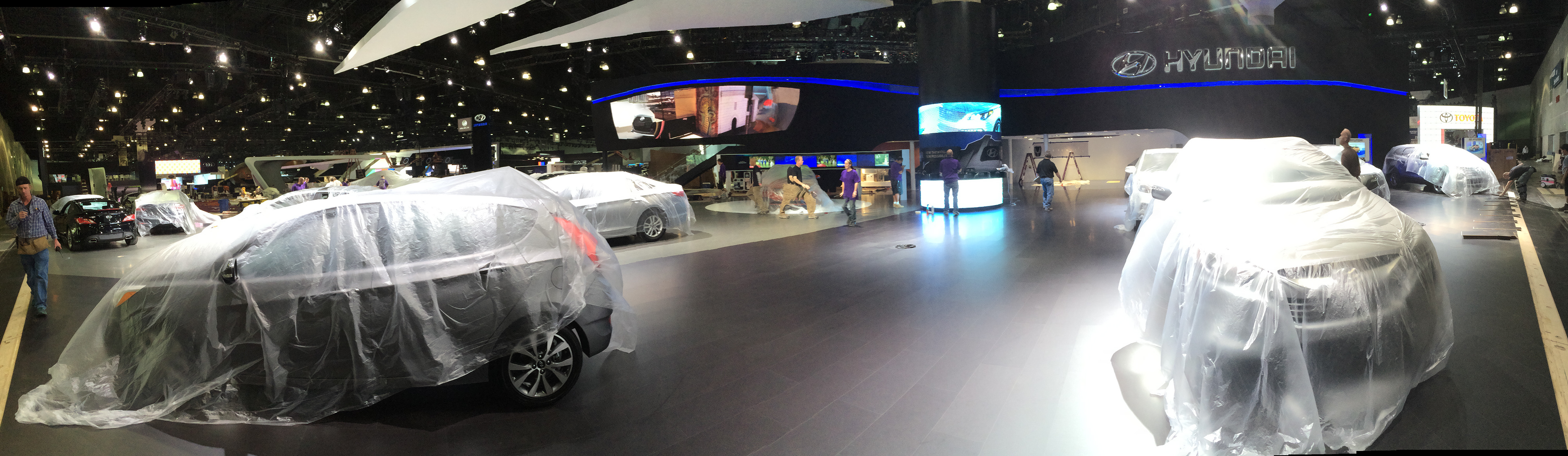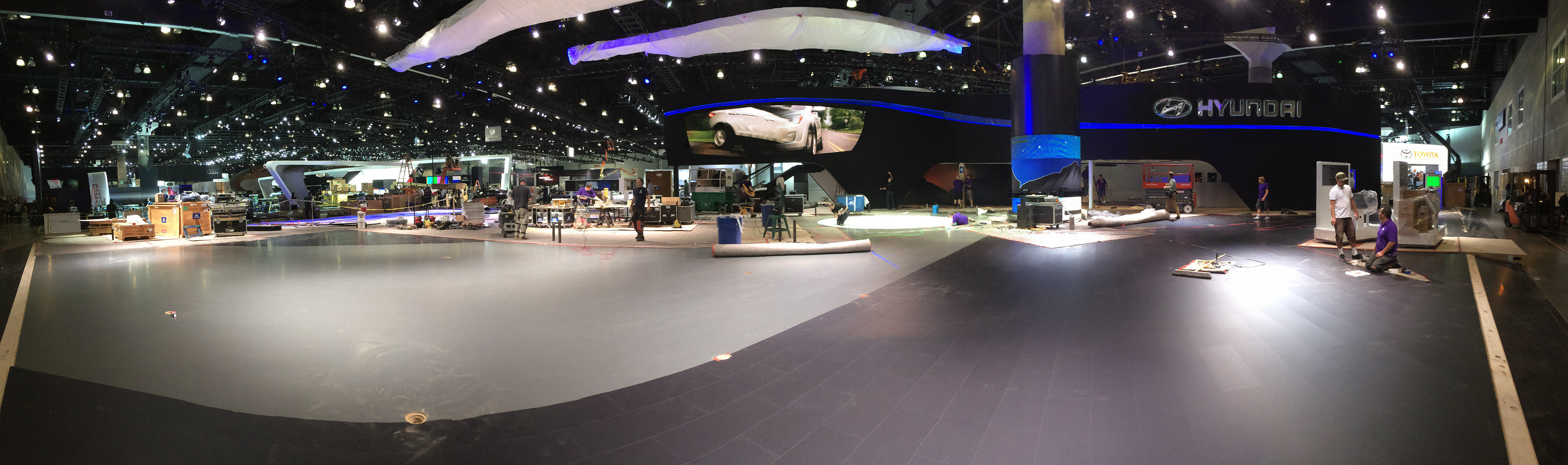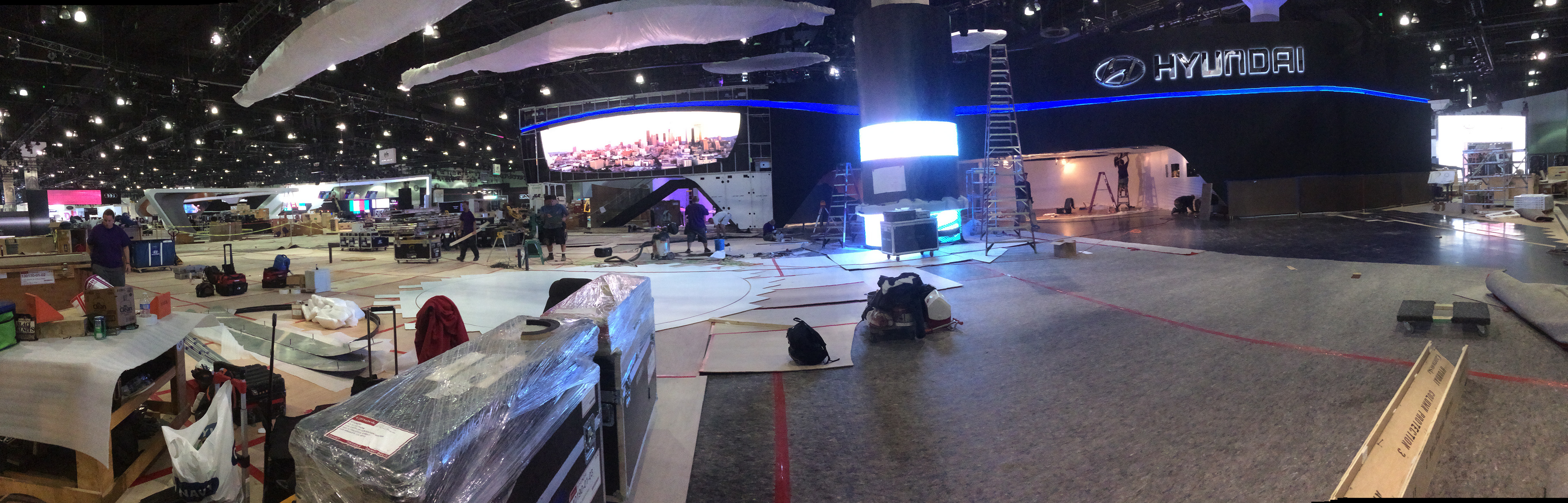 Hyundai Los Angeles Auto Show build set up and graphics installation. Panoramic photos of the evolution of the booth. In charge of graphics production and management, labor, vendors, logistics and oversaw installation of every graphic element for the booth.