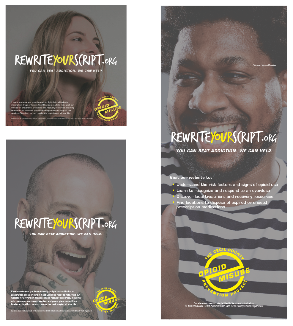 Brochure, poster & bus shelter graphic set for ReWriteYourScript.Org, an organization devoted to beating substance addiction.