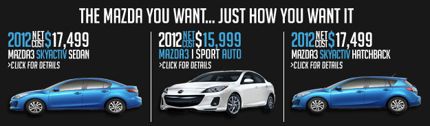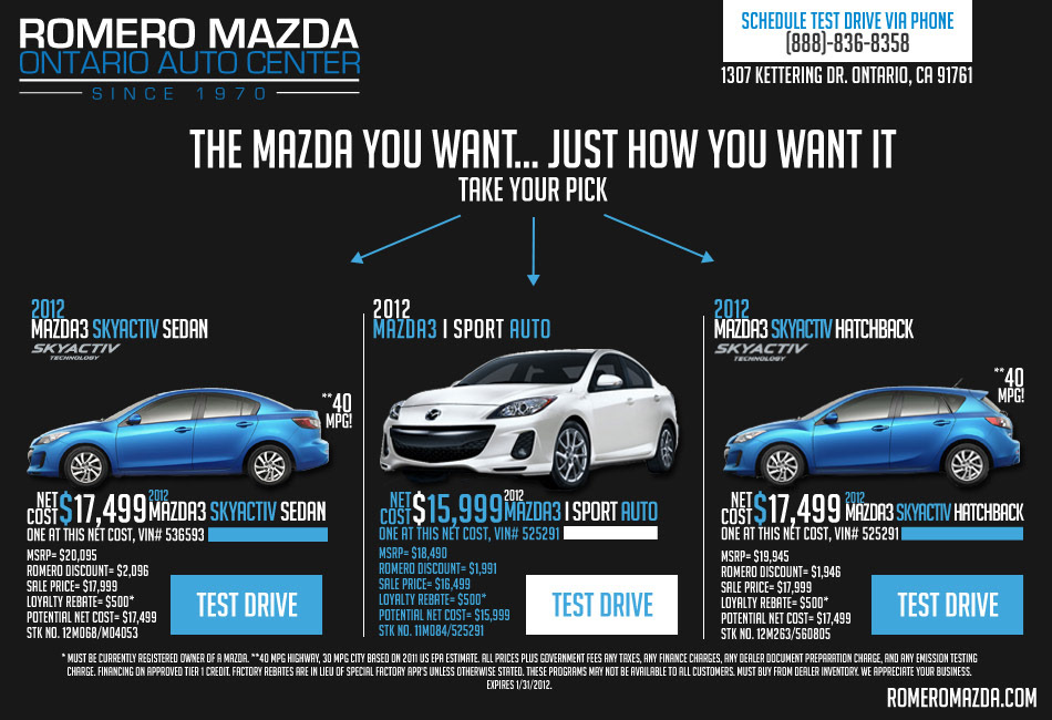 Landing page and web banner for Romero Mazda highlighting the 2012 SKYACTIV vehicles.